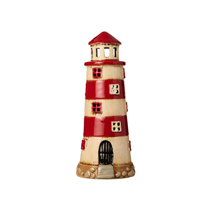 Meget populært kunsthåndværk med et sommerligt og maritimt udtryk. Det charmerende fyrtårn i stentøj er med røde og hvide striber og fra Ib Laursen. Placer fyrtårnet inde eller ude i haven og mærk havets ro og friskhed komme til dig.