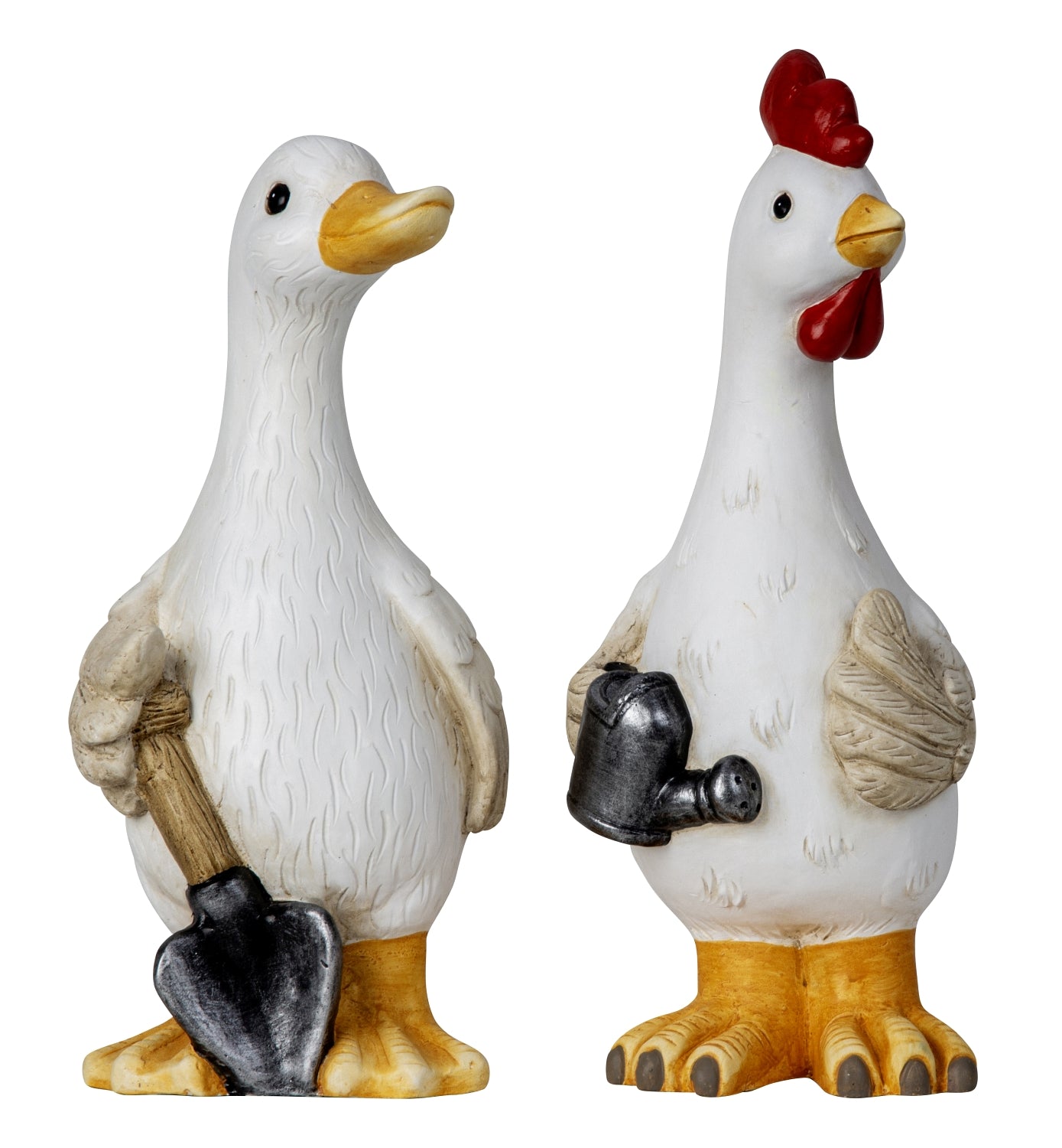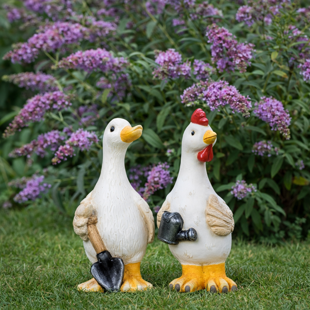 Figurerne har et klassisk og hyggeligt udtryk, der passer perfekt til påskepynt, forårsdekorationer og sommerens udeliv. De fine detaljer i fjerdragten kombineret med redskaberne giver en fortælling om haveliv og spirende blomster. De fungerer smukt som solitære blikfang ved indgangen, på altanen eller placeret blandt krukker og grønne planter.