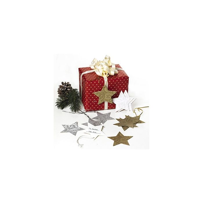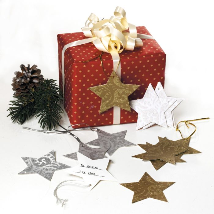 Gavemærker. Stjerneformede gavemærker med glimmer i farverne hvid, rød, guld og sølv.