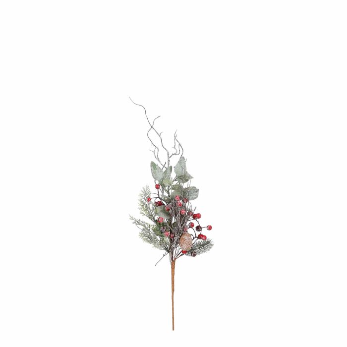 Grangren rød. En skøn gren med både røde bær, eukalyptus og gran. En rigtig fin anordning i en vase eller på væggen. Passer godt sammen med champagnefarvede glaskugler.