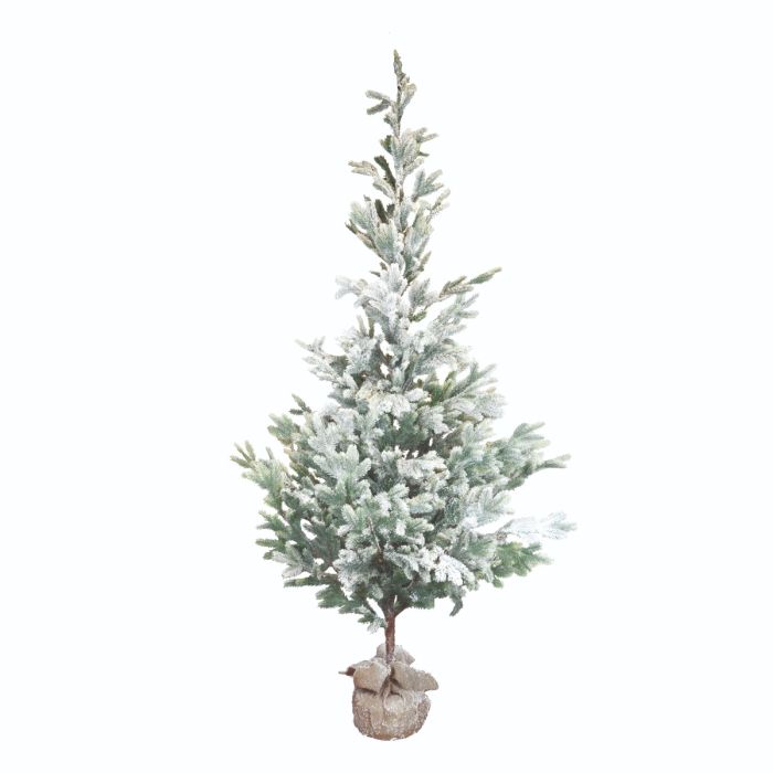 Snedækket juletræ (kunstigt) med sød og dekorativ jutesæk som fod. Træet er tæt forneden og med færre grene øverst. Et træ der kan pynte jul og vinter år efter år.