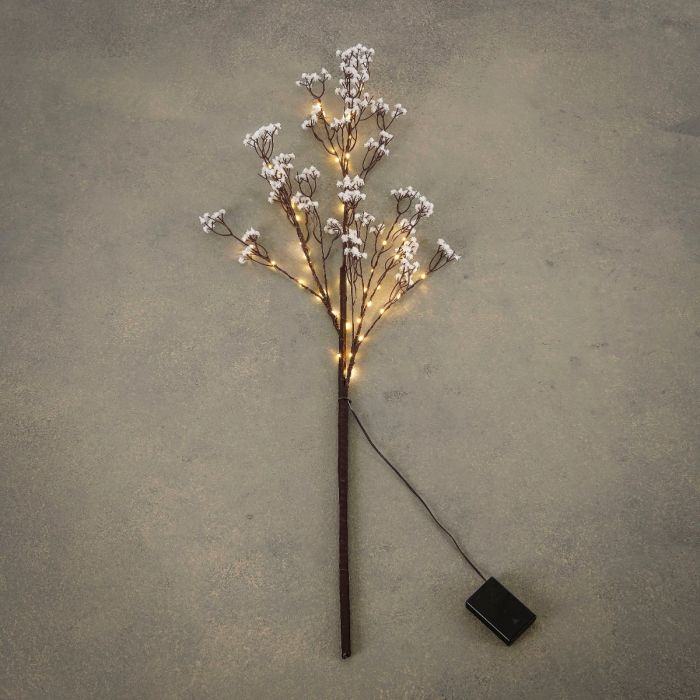 Dekorativ gren med flere smågrene alle med små hvide blosmter og med let frost på. Grenen bliver lyst op af 45 små LED-lyspærer. Grenen giver et hyggeligt og behageligt lys. Den er nem at placere indendørs, da den er batteridrevet. Kombiner den med andre blomster i en høj vase eller gulvvase eller brug den liggende på fx et bord eller på en hylde.