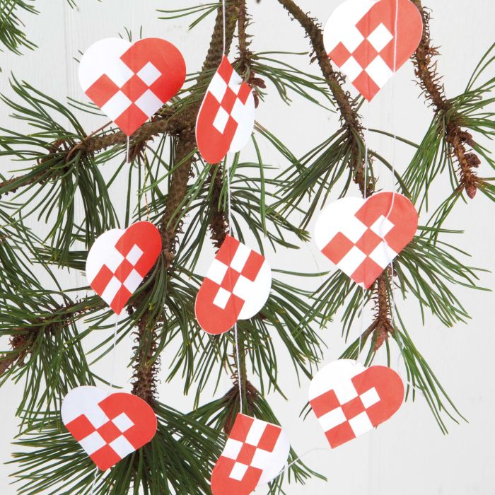 Guirlande med hjerter, der måler 5 cm i højden. Hjerterne sidder på en 2 meter lang snor, og der er 18 hjerter på.