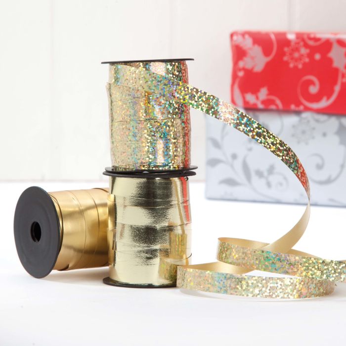 Guldfarvet gavebånd i tre varianter i enten mat, blank eller med mønster. Gavebåndet måler 1 cm i bredden, og der er ti meter på en rulle.
