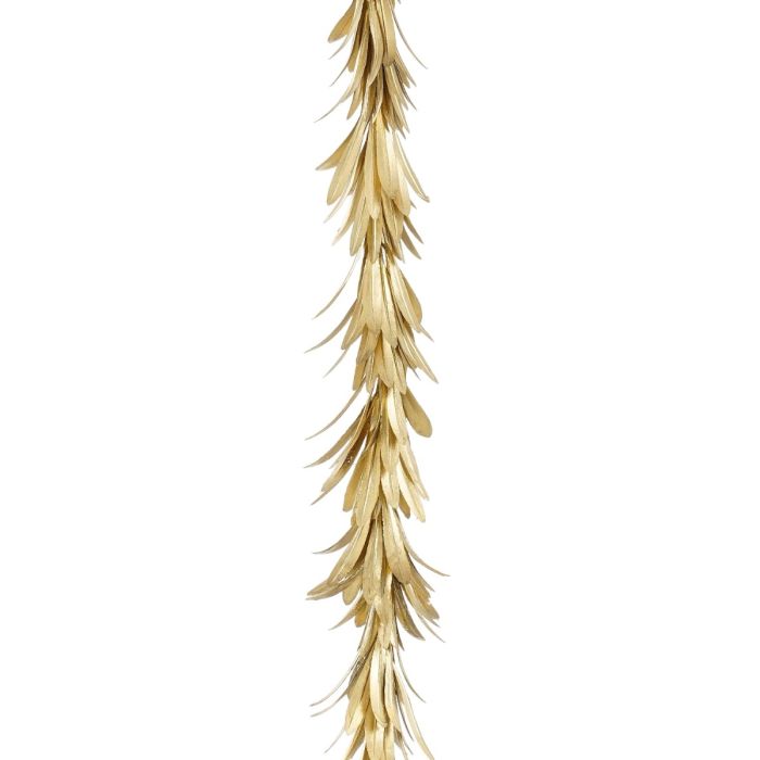 Skab et festligt og elegant udtryk i hjemmet med denne smukke guldfarvede guirlande. Guirlanden er 180 cm lang og designet med smalle blade, der giver et fjerlet og dekorativt udtryk. Brug den som pynt på julebordet, på juletræet, hæng den i vinduet eller læg den langs en hylde eller et spejl for at tilføje et glimt af guld til din indretning. Guirlanden er fleksibel og nem at forme, så du kan tilpasse den præcis til den dekoration, du ønsker. Den fås også i sølvfarvet og hvid.