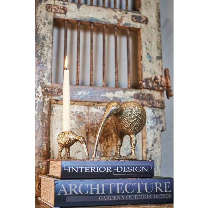 Den New Zealandske nationalfugl, kiwifuglen, i antikguldfarvet med stage på ryggen til kronelys / almindeligt stearinlys. Dekorativ i boligindretningen både med og uden lys i.