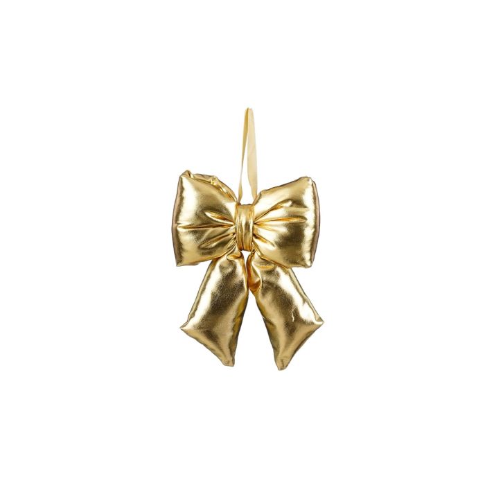 Guldfarvet sløjfe i skinnende stof. Festlig pynt, der straks fanger øjet. Stoffets metalliske look giver et glansfuldt udtryk, mens det bløde fyld gør sløjfen tyk og fyldig, så den fremstår ekstra luksuriøs. Med den praktiske snor til ophæng er sløjfen nem at placere, uanset om du hænger den på juletræets grene eller i de små vinduer. Sløjfen fås også i en julerød version.