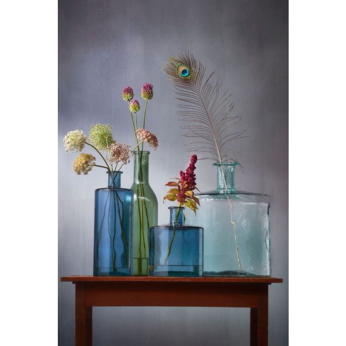 Elegant, høj Guan glasvase i en dyb blå farve, der giver et roligt og moderne udtryk i indretningen. Vasen er håndlavet i ægte glas og har en smuk, slank flaskeform, som gør den særlig dekorativ både med og uden blomster. Med sin høje størrelse fungerer den perfekt som gulvvase, hvor den kan stå alene som et stilfuldt statement eller bruges med lange grene, siv eller kunstige blomster. En tidsløs vase, der passer smukt ind i både nordiske, klassiske og mere farverige hjem.