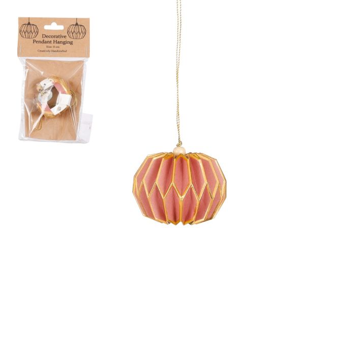 Dekorativ, håndlavet bikube i lyserødt, foldet papir med guldfarvede kanter. Smuk på grene, juletræer og i vinduer. I serien med håndlavede papirophæng, er der i flere former og farver.