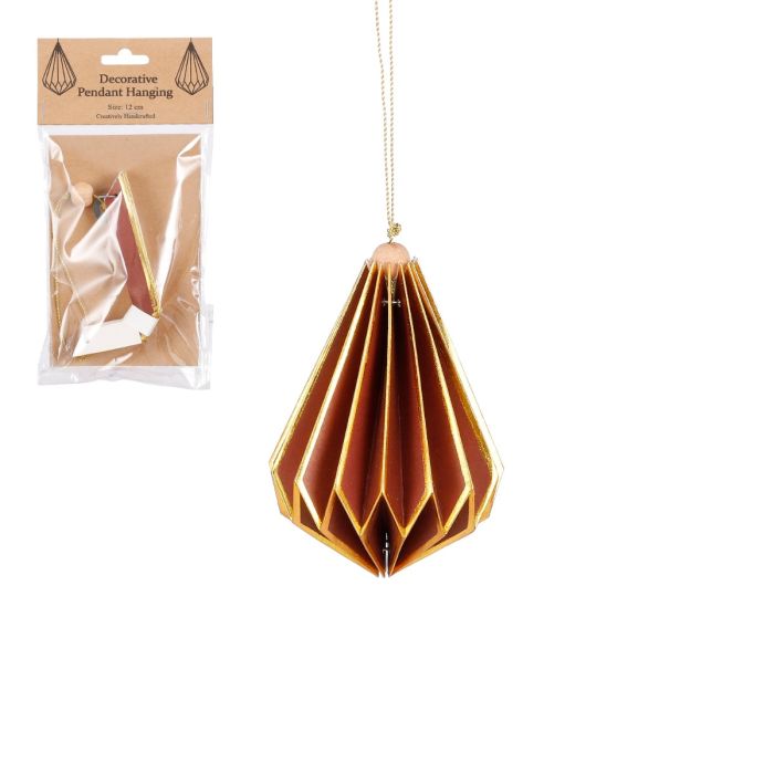 Dekorativ, håndlavet dråbeformet figur i rødt, foldet papir med guldfarvede kanter. Smuk på grene, juletræer og i vinduer. I serien med håndlavede papirophæng, er der i flere former og farver.