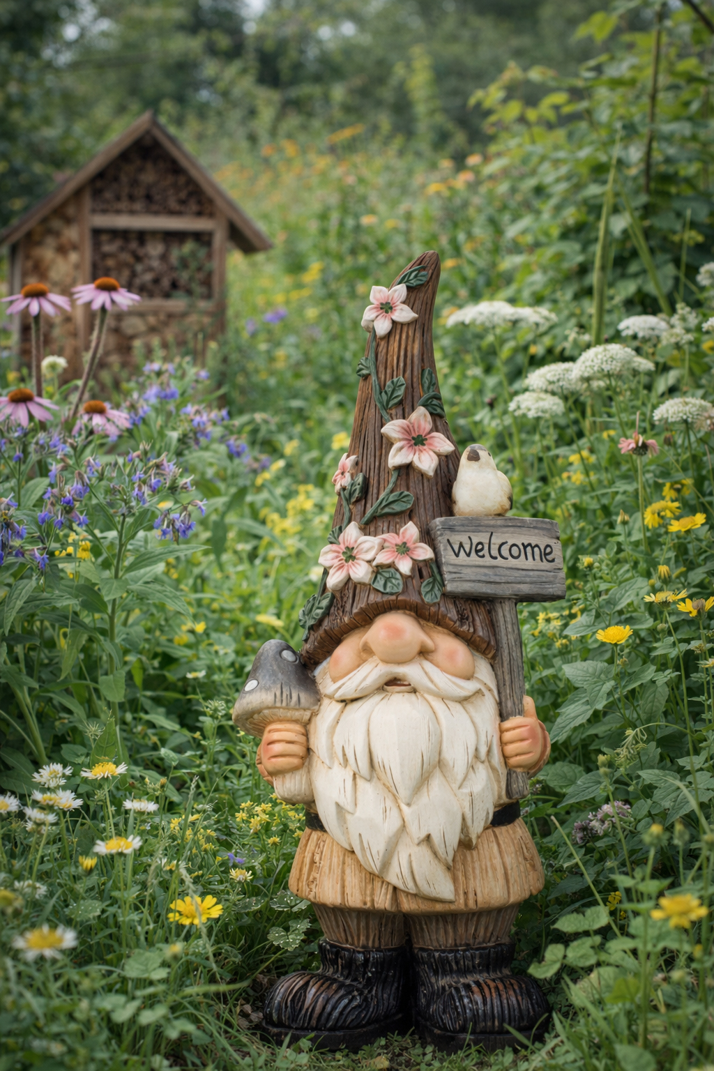 Nissen er fremstillet i magnesiumoxid, hvilket gør ham velegnet til udendørs brug. De fine detaljer giver figuren et klassisk og naturinspireret udtryk. Huen er pyntet med blomster, og i hånden holder han en svamp, mens det lange skæg og den nedtrukne hue over øjnene fuldender det traditionelle gnomdesign. Kombinationen af naturdetaljer og det rustikke udtryk gør ham ideel som blikfang i haven, ved terrassen eller som velkomstfigur ved indgangen.