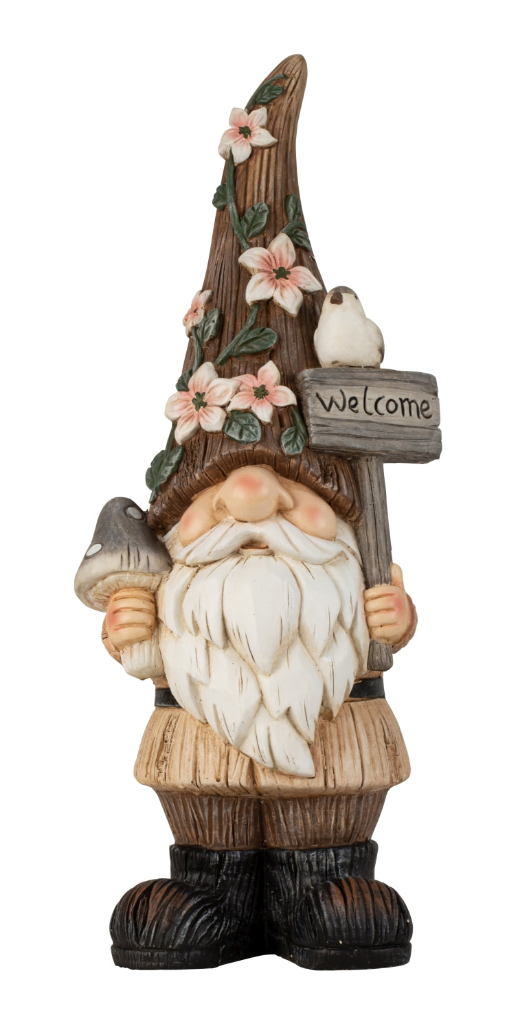 Byd gæster velkommen med en karakterfuld havenisse, der skaber stemning ved hoveddøren eller i haven. Denne store gnomnisse holder et skilt med teksten “Welcome” og er klar til at sprede charme i både forår, sommer og resten af året.