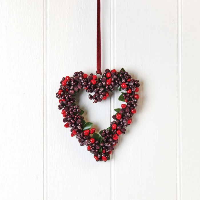 Hjerte med mørkerøde bær og rødt bånd til ophæng. Flot som dørpynt eller i vinduet.