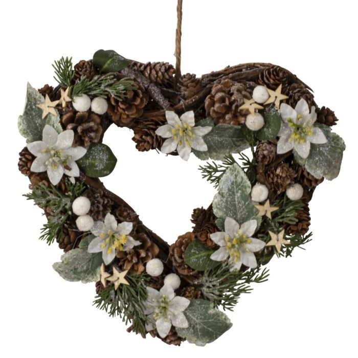 Hjerteformet pilekrans pyntet med forskellige kogler, hvide bær, små stjerner og kunstige hvide helleboorus blomster. Kransen er med let glimmer. Meget fin som dørpynt eller liggende på et bord fx med et stort bloklys i midten.