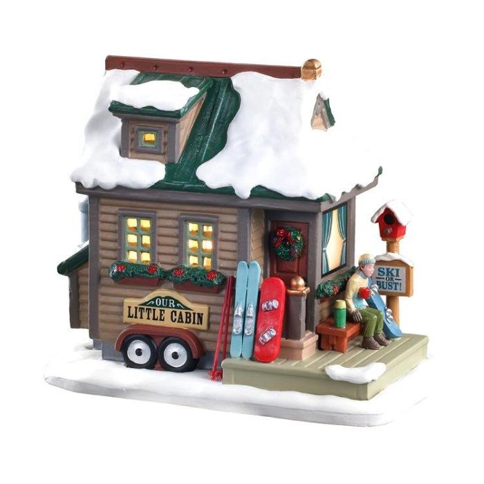 Lille skihytte med sne på taget og skiene stående parat. På bænken gøres der klar til dagen skiløb. Hytten er med LED-lys i.
