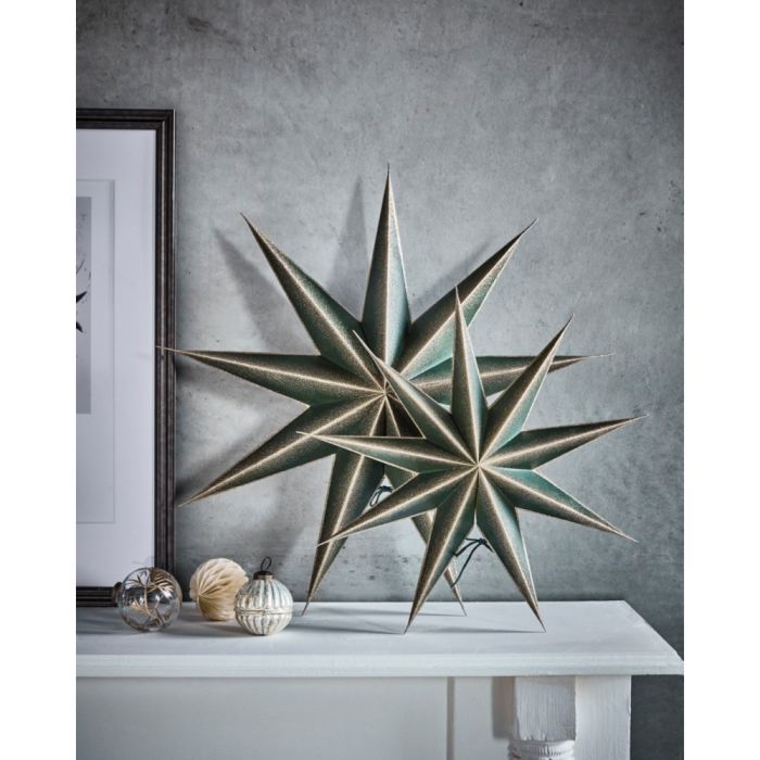 Denne elegante, mørkegrønne stjerne fra House Doctor er dekoreret med smukke champagnefarvede detaljer, der giver et eksklusivt og stemningsfuldt udtryk. Hæng stjernen i vinduet, hvor lyset får mønsteret til at glimte, eller lad den pynte smukt på væggen eller hængende fra loftet. Den er velegnet til en lyskilde, som får de gyldne nuancer til at træde endnu mere frem. Stjernen fås også i en større størrelse.