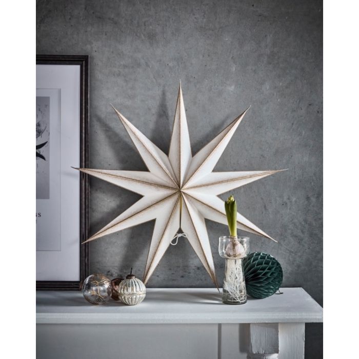 Flot råhvid stjerne med champagnefarvede detaljer fra House Doctor. Hæng stjernen som pynt i vinduet, på væggen eller ned fra loftet og lad julehyggen sprede sig i rummet. Stjernen er velegnet til at sætte lys i og fås i to størrelser.
