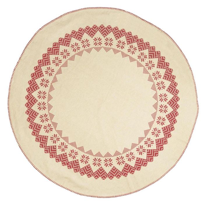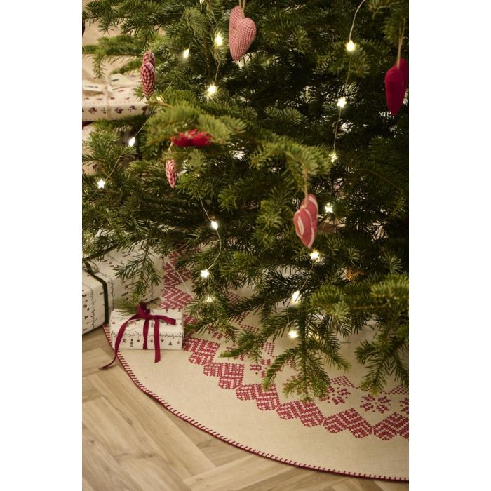 Smukt, naturfarvet juletræstæppe med rødt mønster og dekorative stikninger langs kanten. Tæppet er en del af Ib Laursens Stillenat-julekollektion og fås i både natur/mørkebrunt og natur/rødt. Med sin gode størrelse beskytter det gulvet og fuldender juletræets udtryk med en klassisk og naturlig stil.