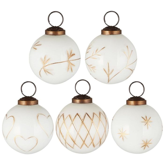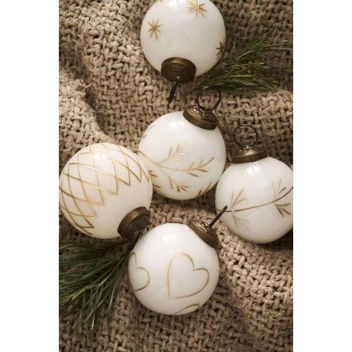 Julekugler i flot design fra Ib Laursen. Sættet består af 5 hvide julekugler i glas med forskellige guldfarvede, indgraverede detaljer. Smukke og iøjnefaldende på juletræets grene. Julekuglerne er også dekorative som bordpynt, på lysbakker eller hængende i vinduet. Fås i flere forskellige nuancer.