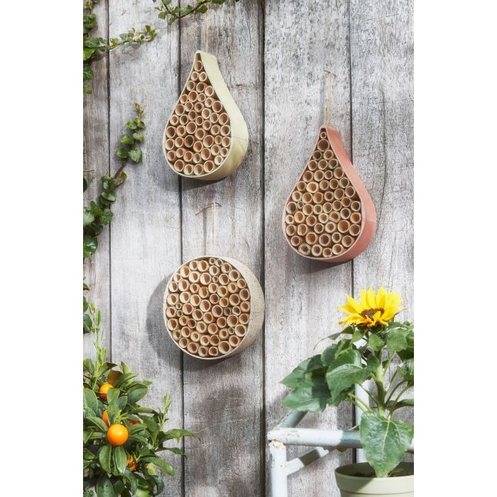 Insekthotel med grå kant, rundt og med lille snor til ophængning et godt sted i haven. Med et insekthotel hjælper du de små dyr og insekter med et godt bo, hvor de kan overvintre og formere sig. Insekthotellet måler 6 cm i højden og har en diameter på 21 cm. Størrelsen gør det let at have overalt i haven eller på altanen. Fremstillet af plantefiber.