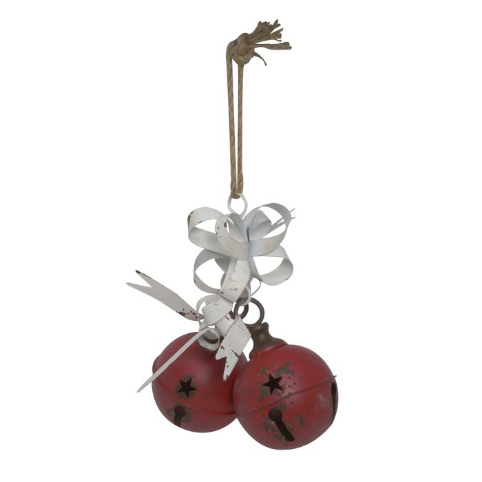Julebjælder i metal med krøllet metalbånd, snor til ophæng og gammelt udseende. Julebjælderne sidder sammen som et par.