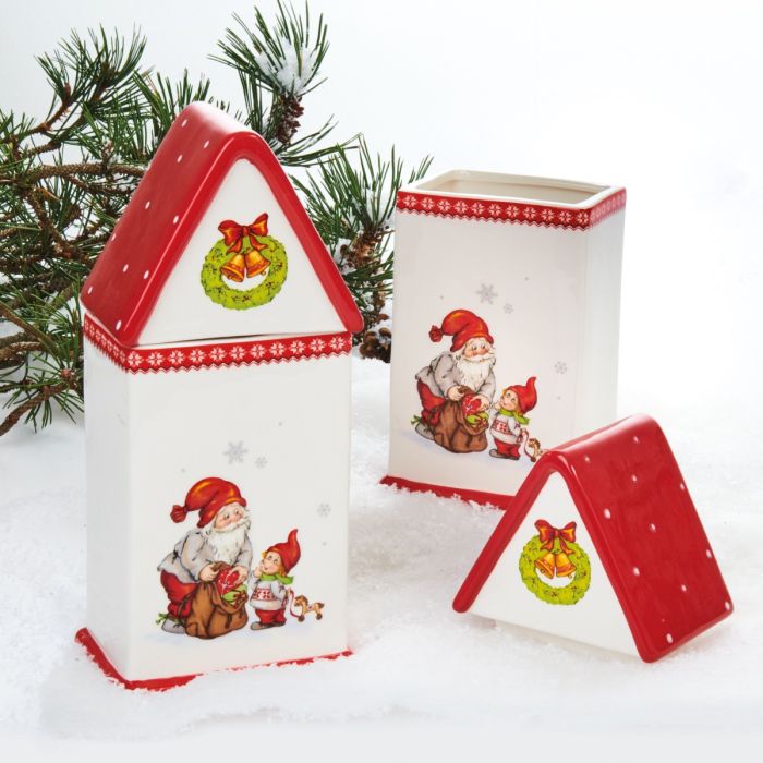 Juledåse i keramik er dekorativ opbevaring til julens godter. Der skabes hyggelig julestemning med denne søde juledåse i keramik, formet som et lille julehus med et charmerende nissemotiv på forsiden. Dåsen er perfekt til opbevaring af julegodter, småkager eller andre søde fristelser, og det er samtidig en dekorativ detalje på køkkenbordet, i vindueskarmen eller på julebordet. Uanset om du bruger dåsen til slik, småkager eller blot som pynt, spreder den ægte juleglæde og nostalgi. En perfekt gaveidé til én, der elsker julen eller bare til din egen juledekoration.