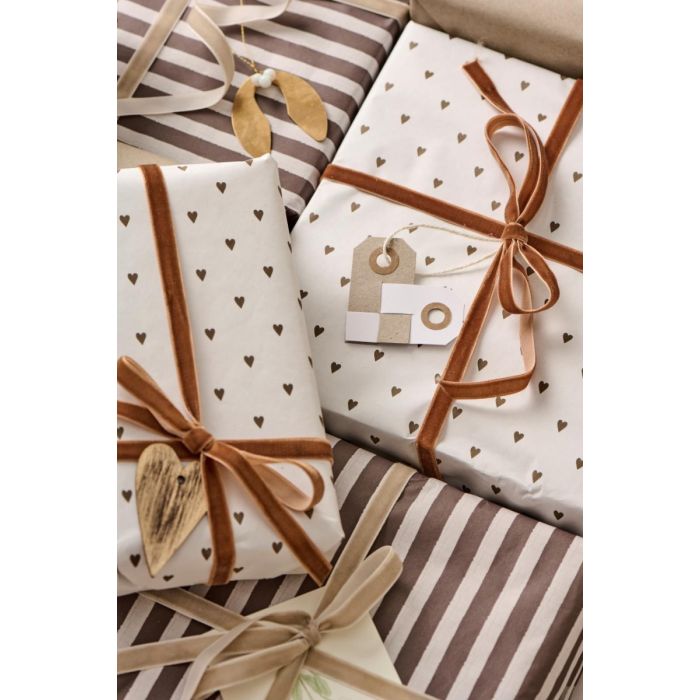 Gør julegaveindpakningen både smuk og bæredygtig med dette fine julegavepapir i genbrugspapir fra Ib Laursen. Papiret er dekoreret med hjerter i varm, brun nuance, der skaber en hyggelig stemning under juletræet. Det kraftige genbrugspapir er både slidstærkt og miljøvenligt. Det egner sig perfekt til indpakning af julegaver til familie og venner. Brug papiret sammen med natursnor, silkebånd eller vores fine velourbånd.