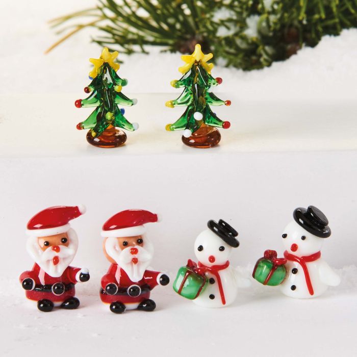 Juleglasfigurer med en højde på 2 cm. Er pakket med juletræer, snemænd og julemænd blandet.