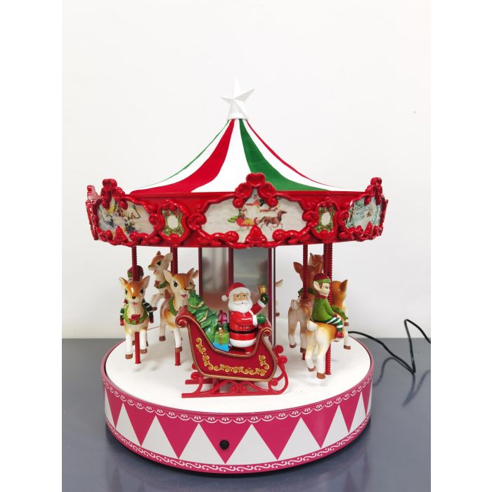 Julekarrusel med julemanden i rød kane, bambier med nisser på og mange små detaljer. Karrusellen er med rødt, grønt og hvid tag med stjerne i toppen. På siderne af taget er der små julestemningsbilleder. Bunden er med røde og hvide trekanter. Karrusellen er med lys, musik og bevægelser.
