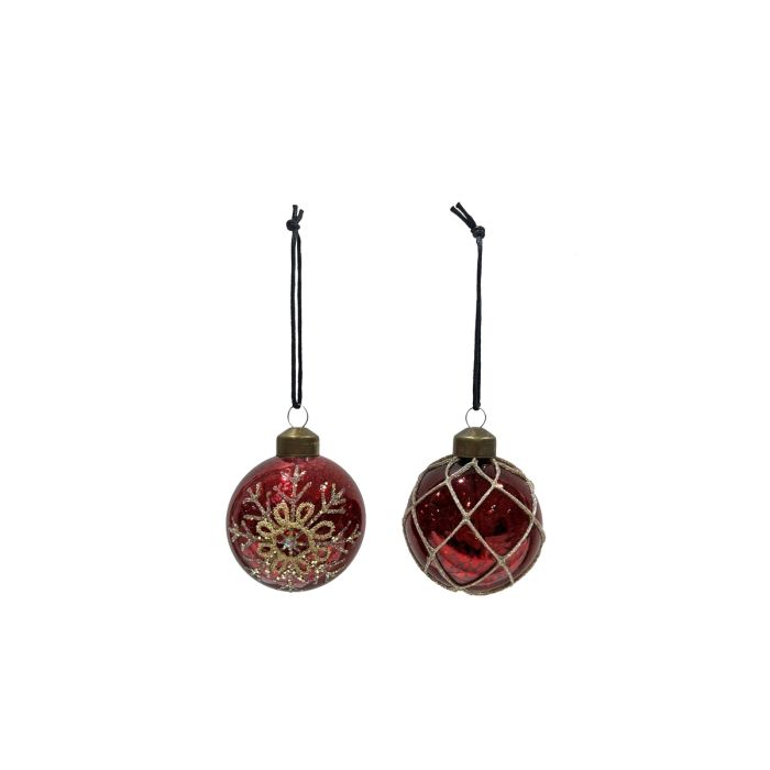 Julekugle med blank, krakeleret rød overflade med enten snefnug eller rudemønster på fra Speedtsberg. Julekuglerne er med deres 6 cm i diameter velegnet såvel til de lidt mindre juletræer som de store og ideele som bordpynt.