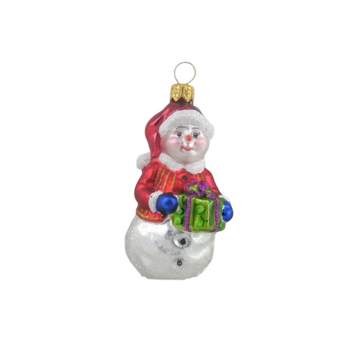 Detaljerig julekugle, der forestiller en snemandsdame med en pakke. Julekuglen er mundblæst og håndmalet hos det østrigske glaspusteri Hanco. Figurkugler på grene og juletræer er skønne blikfang mellem de klassiske julekugler.