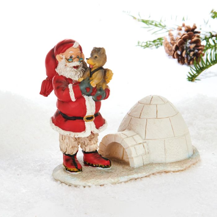De klare farver, den detaljerede iglo og julemandens venlige ansigt skaber en hyggelig og eventyrlig stemning. Kombinationen af sne, dyr og juleglæde gør figuren oplagt til et lille vinterlandskab, en vindueskarm eller som en sød julehilsen i hjemmet.