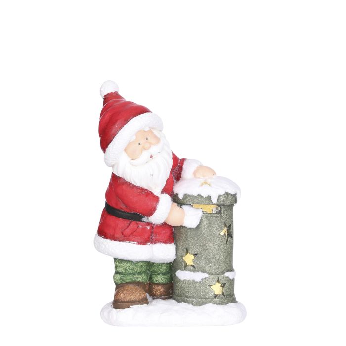 Denne charmerende julemandsfigur spreder varm julestemning, mens han forsigtigt lægger et brev i den snedækkede postkasse. Julemanden står solidt på den hvide vinterbase iført sin klassiske røde dragt, grønne bukser og lune støvler – klar til dagens vigtigste opgave: at sende ønskerne godt af sted.