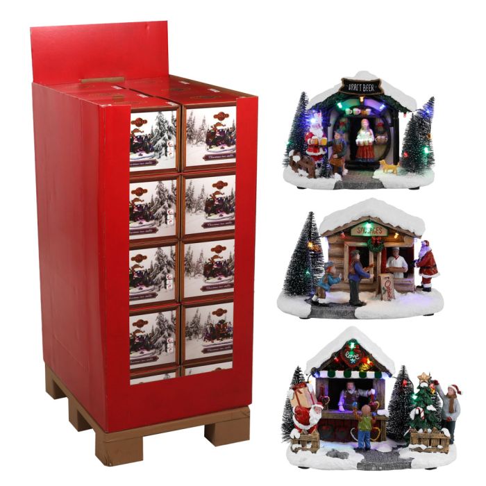 Julemarkedhus med masser af julestemning. Her får du stemningen fra julemarkedet helt ind i stuen med disse julepyntede huse. Findes i tre forskellige varianter enten ølstue, pølsevogn eller honningkagehjertehus. Der er lys i boderne.