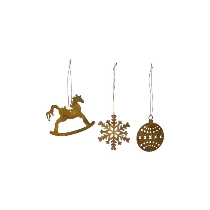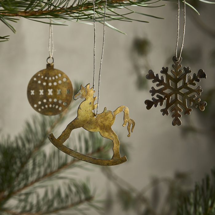 Antik guldfarvet metalpynt formet som enten en gyngehest, et snefnug og en julekugle. Metalpynten er med snor til ophængning på fx juletræet eller i vinduet. Klassisk julepynt fra Speedtsbergs julekollektion.