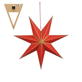Julestjerne i julerød nuance med guldfarvede kanter. Den er fremstillet af bæredygtigt, kraftigt papir. Stjernen er til ophængning i vinduet eller ned fra loftet. Stjernen fås i flere størrelser og i mørkegrøn med guldfarvede kanter.