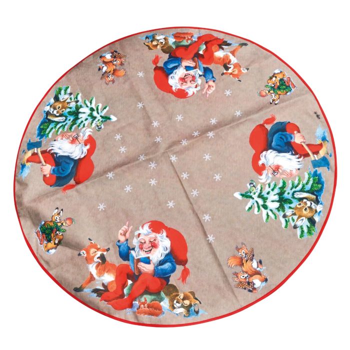 Skab et stemningsfuldt centrum under juletræet med dette store juletræstæppe illustreret af Vilhelm Hansen. Motivet er fyldt med liv hvor nisser og skovens dyr mødes i et hyggeligt vinterunivers der leder tankerne hen på gamle julefortællinger og nostalgiske billedbøger. De varme farver og små detaljer giver tæppet en særlig eventyrlig ro som passer perfekt til decembers hyggelige traditioner. Tæppet er fremstillet i polyester og afsluttet med et rødt kantbånd der rammer motivet ind på smukkeste vis. Med en diameter på 135 cm giver det god plads under større juletræer og skaber en samlet base for gaver pynt og glitrende julelys.
