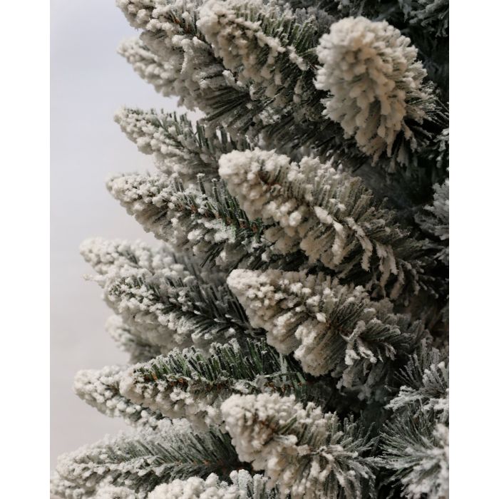 Smukt, vinterligt juletræ med lange, bløde nåle fyldt med "sne". Træet er tæt med mange grene og skåret i skarp, trekantet form.