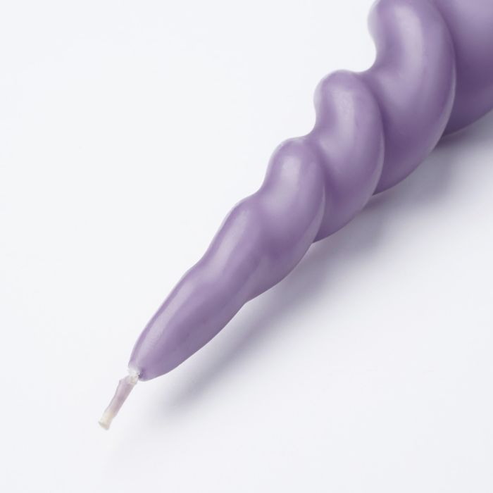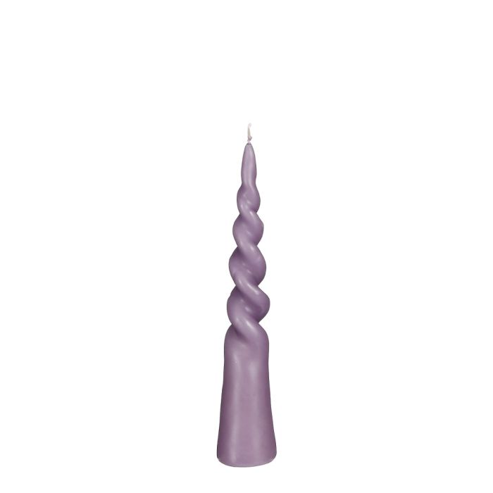 Kegleformet lys i flot, lilla farve med snoet top fra Mica Decorations. Lyset har flad bund, så det kan stå direkte på bordet, lysfadet eller i en stage. Stil lyset alene eller sæt flere sammen i små grupper og skab en hyggelig belysning. Lyset findes i mange farver.
