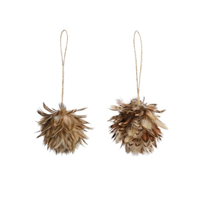 Kogleformet pynt i naturlige, brune fjer med snor til ophængning på grene, i vinduer eller på juletræet. Fjerene varierer i farver og mønstre.