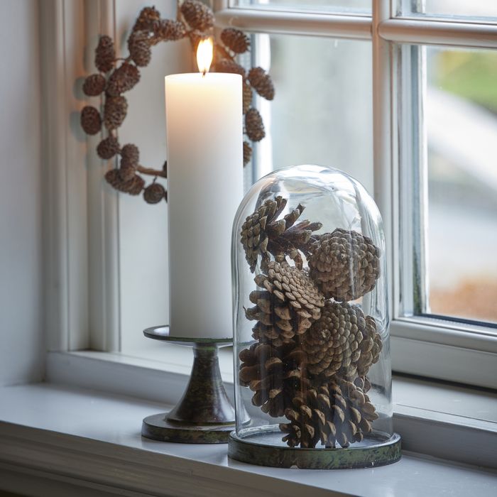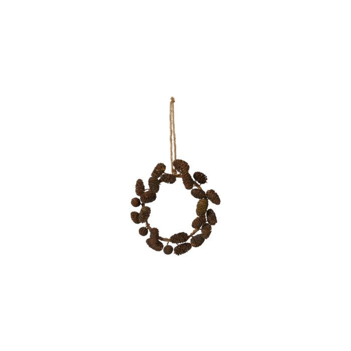 Fin, lille, dekorativ koglekrans med mørkebrune kogler og snor til ophængning. Kransen er fra Speedtsberg og fås i tre størrelser. Kan fx hænges i vinduet eller bruges som dørpynt.