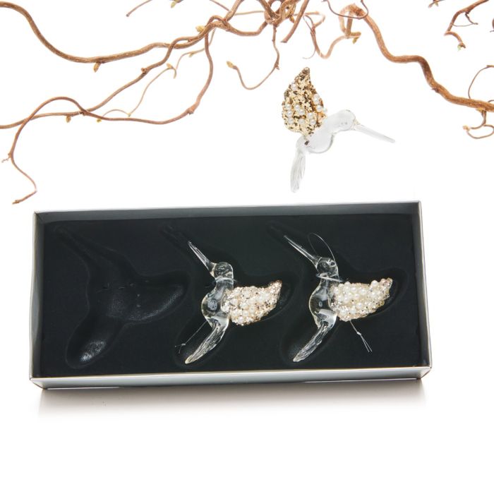 Kolibrier i glas med perlebesatte vinger. Smukke glasfigurer fx til pynt på juletræet.