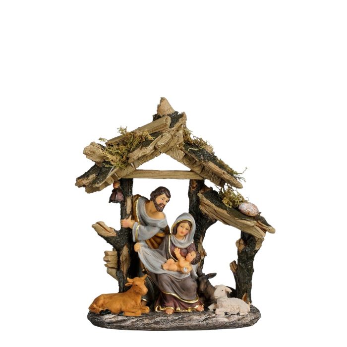 Dette smukke krybbespil fra House of Seasons er 21 cm højt og lavet i polyresin, hvilket giver figurerne en flot, detaljeret overflade og en holdbar kvalitet, der kan tages frem år efter år. Scenen er bygget op omkring et rustikt staldomrids i varme naturtoner, hvor træstrukturen og det let mosbeklædte tag skaber en hyggelig, jordnær atmosfære.