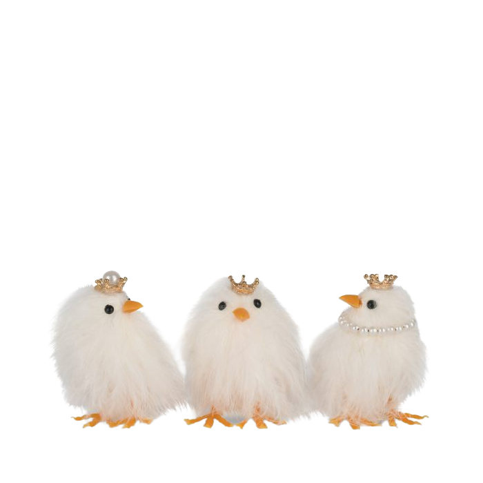 Disse tre hvide påskekyllinger danner tilsammen et stemningsfuldt og legende indslag i påskens dekorationer. Kyllingerne har bløde naturfjer og små kroner på hovedet, som giver figurerne et finurligt og iøjnefaldende udtryk. De forskellige blikke og positioner skaber en levende helhed, hvor kyllingerne ser ud til at reagere på hinanden og omgivelserne.