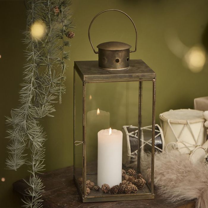Sofus Lanterne i messingfarvet metal med glas i siderne og flad skorsten på toppen. Klassisk og stilfuld design fra Ib Laursen. Lanternen skaber et skønt skær i såvel boligen som på terrassen.