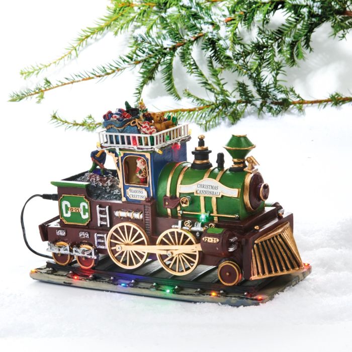 Lokomotiv i gammeldags stil med kul på ladet. Lokomotivet er med lys i skinnerne, og der kan sættes lyd på. I førerhuset skimtes en lille julemand, og der er læsset julegaver på toppen af førerhuset. Mange flotte detaljer.