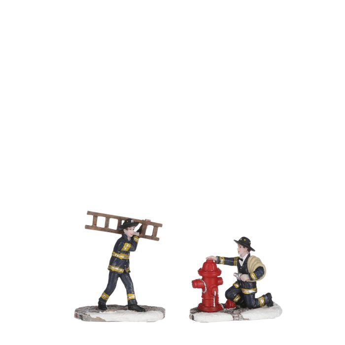 Der er fuld aktivitet i julelandskabet, når brandmændene er på arbejde. I denne 2-pak møder man to forskellige brandmænd i klassisk uniform, som tilsammen skaber en lille scene fuld af handling. Den ene brandmand er på vej frem med stigen over skulderen, klar til indsats, mens den anden har taget plads ved den røde brandhane for at sikre vandforsyningen. Figurerne passer perfekt ind i bymiljøer i julelandskabet, hvor de tilfører liv, bevægelse og en fortælling om hverdagshelte midt i vinterkulissen. Sammen giver de ekstra dybde og variation til nisselandskabet og julebyen.