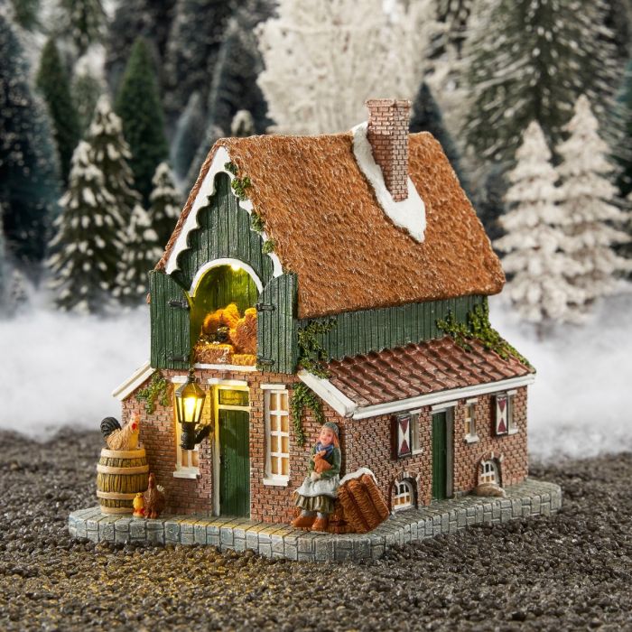 Der er masser af dyr at kæle med på gården. Pigen sidder roligt med den lille kanin i skødet. Katten er listet på på høloftet, mens hanerne holder til ved tønden. En stemningsfuld og detaljeret bygning.