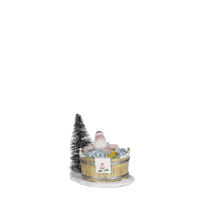 Selv julemanden har brug for en pause – og her nyder han et velfortjent hvil i sit lune boblebad. Omgivet af vinterens sne og et lille juletræ ved siden af karret, sidder han afslappet i skummet med sit hvide skæg og nissehuen stadig på plads.