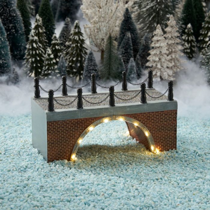 Brostykke til kanalkant eller kajkant med røde mursten på siderne, grå brosten som vej og sorte pæle med kæder imellem på begge sider af vejen. Rundt langs broen sidder en lyskæde og lyser op. I samme serie, findes også lige vejstykker, buede vejstykker og trapper.